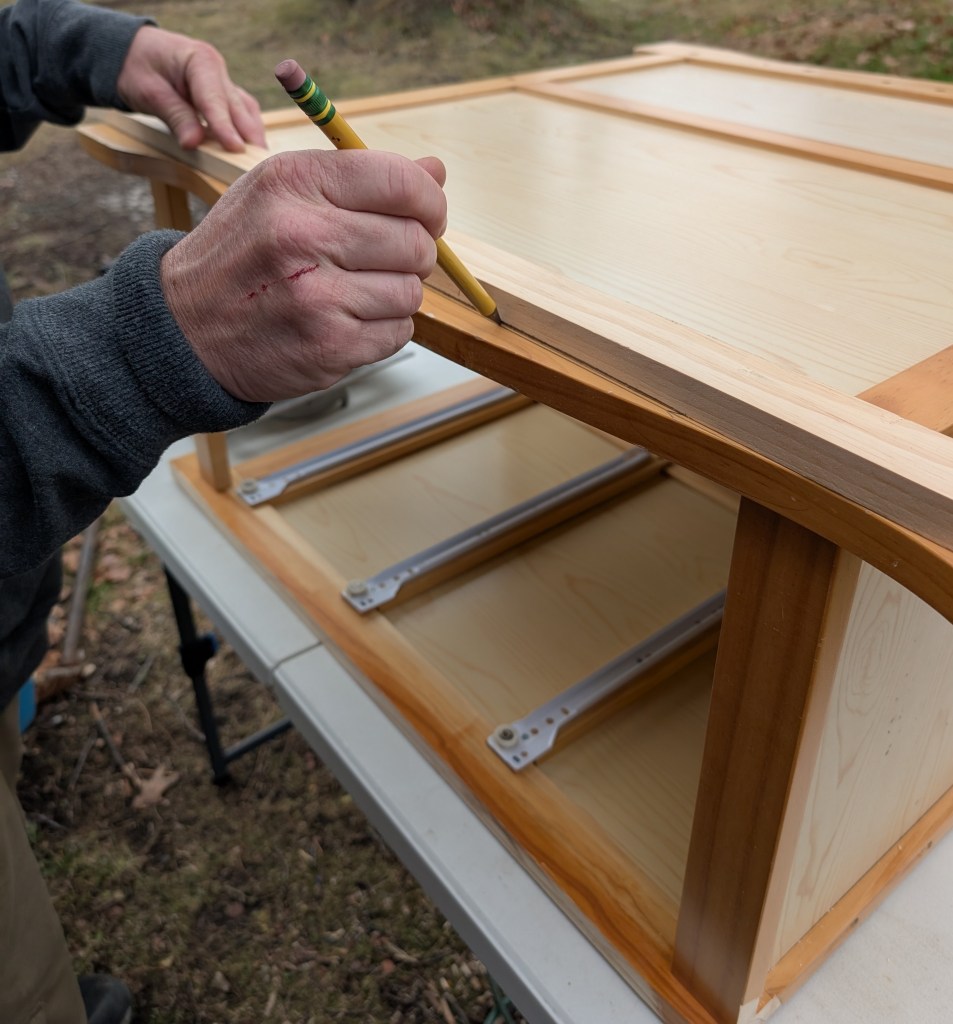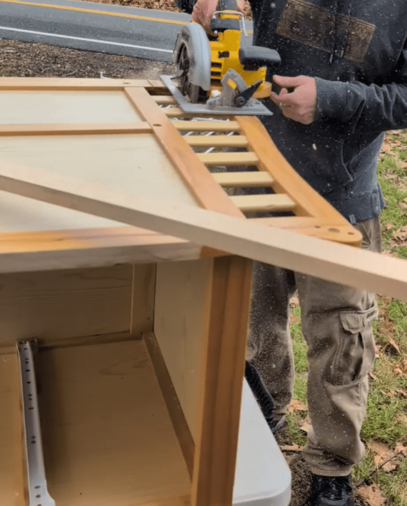 Jay used a circular saw to cut the top off. After the first cut, the side safety planks popped right out leaving a flat top edge for the new top. He trimmed the corners to match the sides. And then with a guide, drew a straight line along the back and front legs and cut those straight with the circular saw.