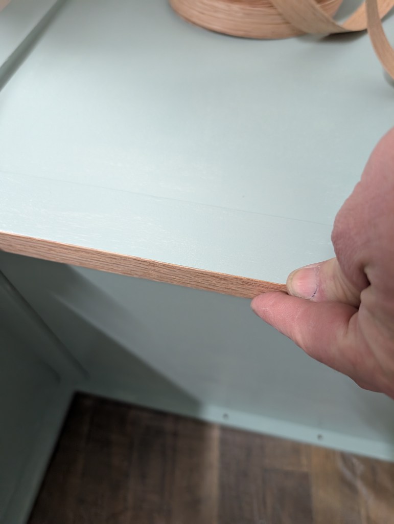 Knowing we would be putting wheels on the finished cart I wanted the shelves completely exposed to make it more functional. Jay removed the side panel that covered one side of the shelves with a reciprocating saw. Once he cut the panel, it popped right out. He used iron on banding to close the gap.