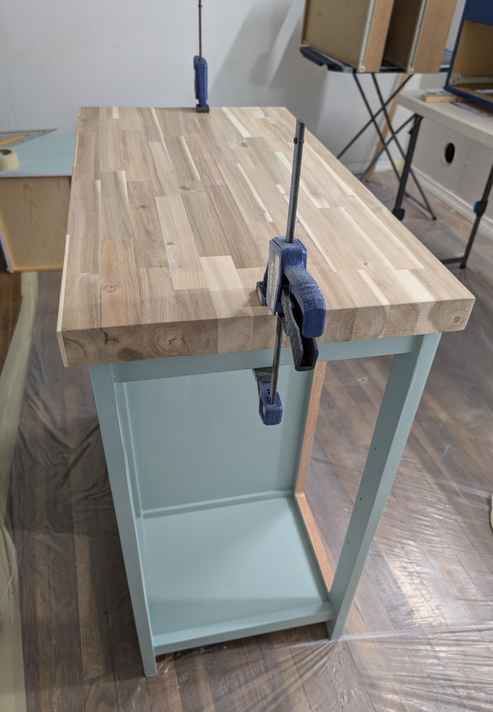 I purchased a piece of unfinished butcher block online. It took some shopping around to find a good deal. I’ll post the information below. Jay cut the butcher block to size and attached it to the top of the cart with wood glue and screws. He clamped it overnight.