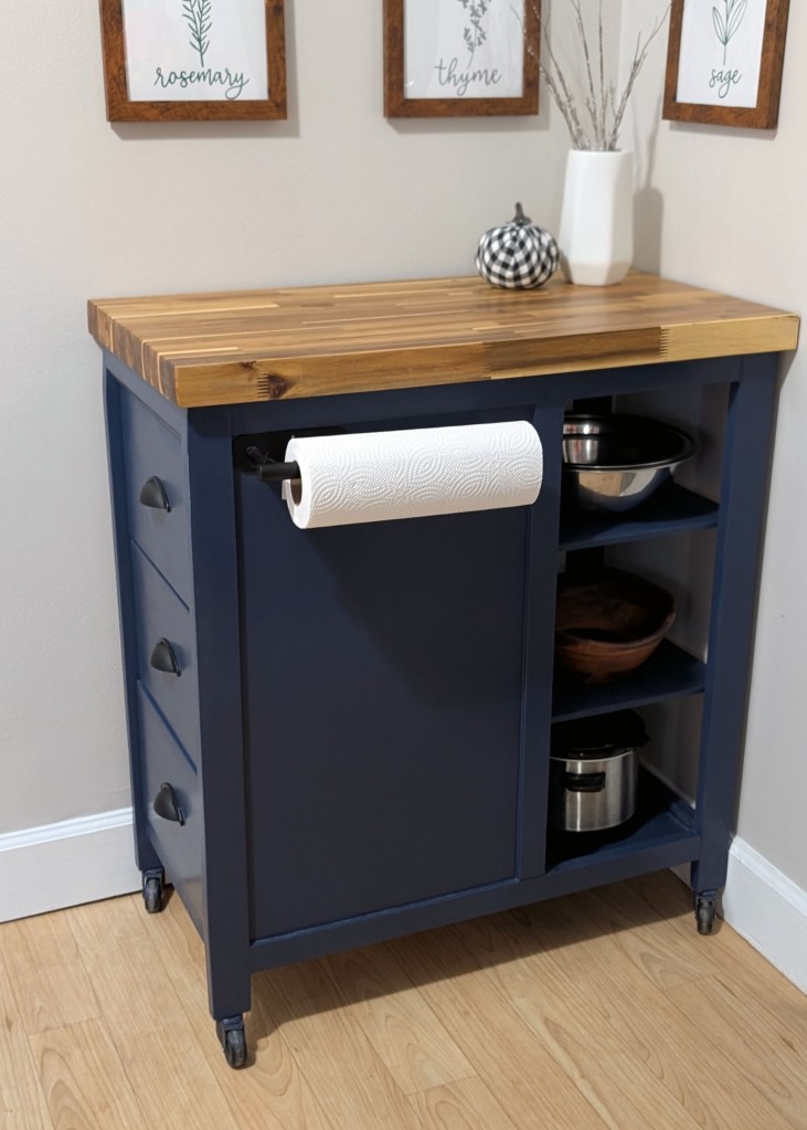 We stained and sealed the butcher block and here’s the finished, repainted piece in my space. I added a paper towel roll holder to the side and absolutely love how useful this cart has been in my small kitchen/dining area.